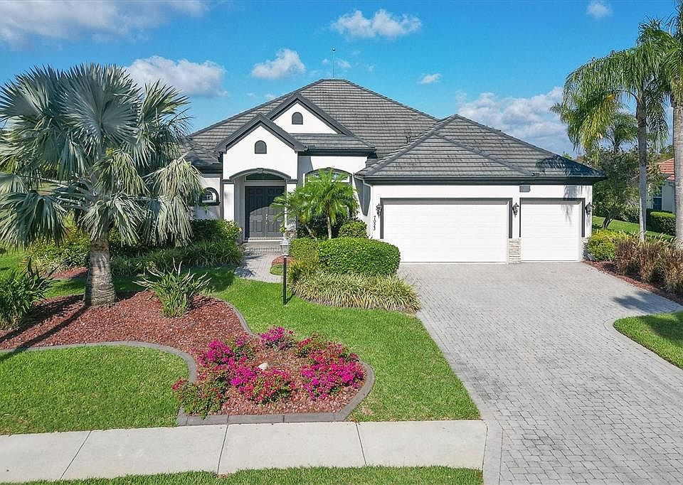Located in the prestigious Lakewood Ranch Golf and Country Club, this spectacular Todd Johnston-built home has it all. Breathtaking sunset views overlooking the lake and golf course, high ceilings, split floor plan and spacious white kitchen. Featuring three spacious bedrooms, four-and-a-half baths and a three-car garage with abundant storage for all your toys. Numerous upgrades throughout, including crown molding, neutral palette, custom draperies and window coverings, plantation shutters and built-in closet organizers. The spacious kitchen with views of the lanai and golf course offers a large walk-in pantry, GE five-burner range, granite countertops, breakfast bar and aquarium window in the kitchen nook. Host formal dinners in your elegant dining room that opens to living room, where outdoor and indoor entertaining areas flow seamlessly via multiple sliding door walls. Relax in your pool or spa after a day of play while enjoying your favorite cocktail overlooking the ever-changing sunset. A split bedroom floor plan, guests will enjoy the privacy of two spacious full guest baths flanked by two guest bedrooms. The den, located in the rear of the home, offers privacy, custom-built in cabinetry and amazing golf course views. Your master bedroom offers privacy yet practicality with dual walk-in closets and is highlighted by views of the pool, lake and golf course. The grand master bath includes dual sinks, soaking tub and dual-entry walk-in shower and makeup vanity. Add to all this a spacious upstairs bonus room with lanai and a half bath. This breathtaking and unique residence is perfect for family living or entertaining. The perfect location where you can easily access downtown Lakewood Ranch and all that it offers, including the cinema, dining options, boutique shops and more. Lakewood Ranch has been ranked as one of the best-selling master-planned communities in the nation. Live, work and play in elegance, style and serenity. Paradise awaits!