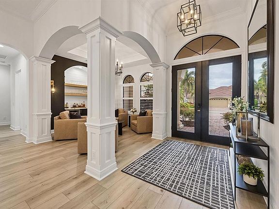 Under contract-accepting backup offers. Welcome to this stunning, completely remodeled in 2024 residence in the gated maintenance-free area of Lakewood Ranch Country Club. As you step through the impressive double-glass doors of this breathtaking and completely transformed residence, you are greeted by an airy, light-filled ambiance. This luxury three-bedroom home includes three en suites, a den, and a powder room for comfort and convenience. The meticulously renovated home showcases soaring ceilings, an open floor plan and premium upgrades throughout. The grand living room features a custom fireplace wall with a 76-foot linear electric fireplace, 85-inch Samsung smart TV and Sonos soundbar. Faux cement texture, fluted wood accents, shelves and a charming mantle create a contemporary design. A 12-foot coffered ceiling with crown molding and a designer chandelier enhance the space, while the pocket slider extends the living area to the lanai for seamless indoor-outdoor living. The custom wine bar features dual wine refrigerators, custom cabinetry, a stunning accent wall, floating shelves and quartz countertops. The gourmet kitchen includes GE Cafe appliances, white cabinets with glass uppers, black handles, a quartz island and a subway tile backsplash. A hand-crafted Hoodsly hood, porcelain farm sink, and Kohler faucet elevate the kitchen's sophistication. Off the kitchen is a versatile den with double French doors, built-in shelving and a hidden Murphy bed for flexible use. The primary suite boasts a tray ceiling, dual closets and direct pool access. The spa-like bath includes marble porcelain floor tiles, a walk-in rain shower, black-and-gold Pfister hardware, quartz countertops and a standalone soaking tub under a designer chandelier. Each of the two guest bedrooms has its own en-suite bath, with oversized walk-in showers, black-framed glass enclosures, and finishes like gold Moen hardware and quartz countertops. The laundry room features a quartz waterfall countertop and GE Smart washer and dryer, with a penny tile backsplash. Outside, a private tropical sanctuary awaits, with beautiful landscaping creating a secluded retreat. The expansive lanai, surrounded by lush landscaping, includes a sparkling pebble finished pool and spa. Additional details include LED lighting, new plantation shutters, custom closets, luxury plank flooring, freshly painted interiors and all-new hardware. In Lakewood Ranch Golf and Country Club, this home offers resort-style living with optional access to world-class amenities including two practice ranges, four spectacular, award-winning golf courses, two pools, tennis, pickleball, restaurants and more. Don't miss the chance to own this masterpiece in one of Florida's most desirable neighborhoods!