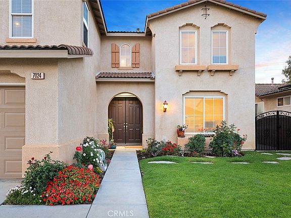 Elegant Pool & Spa Oasis with First-Floor Bedroom, Office, and Bathroom. Step through grand double doors into this beautifully designed 3,360-square-foot Eastvale retreat (actually measured larger at 3,573 sqft), offering the perfect blend of comfort, style, and functionality. With 5 spacious bedrooms, 3 full bathrooms, a dedicated office (not included in the bedroom count), and a large upstairs entertainment room, this home is made for both everyday living and unforgettable gatherings. The sunlit, open-concept main level features a chef’s kitchen with corian countertops, stainless steel appliances, and an oversized island that flows seamlessly into the inviting family room with a cozy fireplace. Sliding doors lead to a resort-style backyard complete with a covered patio, a sparkling pool, and a relaxing hot tub—perfect for starlit evenings or sunny weekends. Downstairs, you’ll find a private bedroom and full bath—ideal for guests or multi-generational living—along with a separate office for remote work or study. Upstairs, the serene primary suite invites you to unwind with a spa-like bathroom that includes a soaking tub, dual vanities, and a generous walk-in closet. The additional bedrooms are generously sized, and the upstairs laundry room adds convenience right where you need it—no more hauling baskets up and down stairs. Located minutes from Eastvale Gateway’s shopping and dining hotspots—like Target and Blaze Pizza—and close to SilverLakes Equestrian and Sports Park and scenic trails, this home also offers quick access to I-15 and CA-91 for an easy commute to Riverside and Orange County. Experience the perfect fusion of upscale living and Eastvale’s vibrant lifestyle—this home is a must-see.
