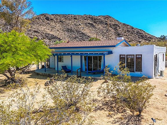Incredible opportunity to own a one-of-a-kind desert property in the quiet, desirable and scenic Sherman Heights area of 29 Palms. This beautiful 2 bedroom home (with a 3rd bonus room/office space) is nicely situated on over 2 acres of land with Joshua Tree National Park as your literal backyard. Minimalistic living with all the comfort, this home features multiple mini-splits to keep you comfortable year round, painted concrete floors and large windows that let in an abundance of natural light throughout. As you make your way into the awe-inspiring living room you'll find gorgeous wood beamed ceilings and walls, ceiling to floor built-in shelves and tasteful decor. The 2 bedrooms and bonus room follow suit with the gorgeous wood-work while the kitchen and dining room hold the home's vintage charm with painted brick walls and tile flooring. The dining room also adorns a wood-burning fireplace to add warmth and ambiance during those cool desert months. The kitchen is complete with ample cabinets and storage space, white tile countertop & appliances and a picture window above the kitchen sink to take in the gorgeous desert views. This home's lovely neutral color palette makes it extremely versatile for any decor and style. That's just the inside! Outside you'll be delighted to find a large covered patio, the perfect place to cozy up and watch the sunrise, mature desert plants and natural landscaping, a fully fenced yard (though the lot lines goes well beyond) and ample space to entertain or relax around a firepit on a starry desert night. Not to mention the stunning, panoramic desert, mountain and city lights view; you'll never want to leave. Located less than 15 mins from downtown Joshua Tree, local shops, eateries, downtown 29 Palms & more but still far enough away to enjoy all the peace and serenity our beautiful desert has to offer. A property like this rarely becomes available, come take a look & let the desert's allure do the rest. Your new desert home, artist retreat, airbnb or weekend getaway awaits.