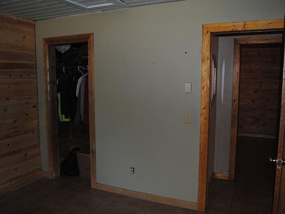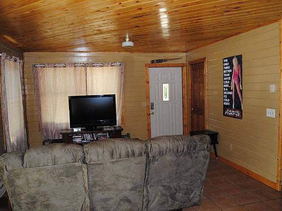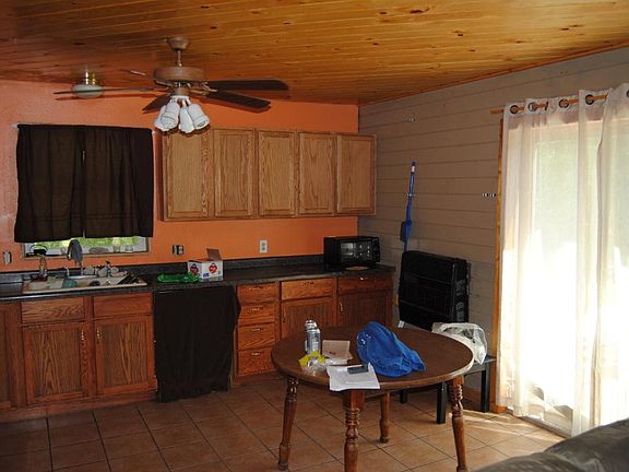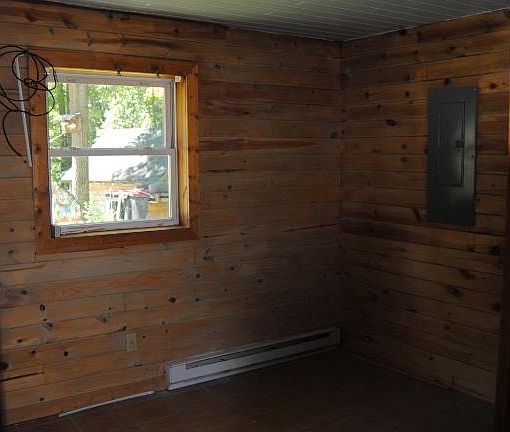 One level living across from Lake Camillia on wooded lot. Steel siding, with log front in floor heat ran but not hooked up. Knotty pine inside., Directions m