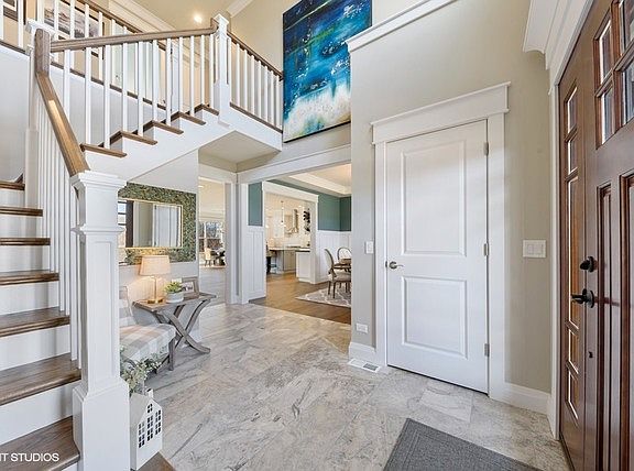HGTV can take lessons from this gorgeous home! Custom-built, new construction, and low maintenance Hardyboard siding and stone exterior. Enjoy sunlight drenched rooms with spectacular golf course fairway views. Open concept living at its finest with 9' ceilings and high-end wide-plank hardwood floors throughout the main living areas. The Chef's kitchen features all stainless appliances including an in-wall oven and microwave/convection combo, refrigerator, cooktop/ventilation hood, beverage center and refrigerator, deep stainless sink, gorgeous subway and lantern tiled backsplash, and a 10-foot quartz center island overlooking the expansive great room. Great room features a huge picture window, stack-stone fireplace and custom built-ins flanking the fireplace. Enjoy a first-floor master bedroom and spa-like master bath with free standing soaker tub surrounded by shiplap, custom highboy cararra marble vanities, over-sized walk-in shower with dual heads, private water closet, and a spacious walk-in closet with customized closet organizers. First floor also includes an open but cozy formal dining room adorned with wainscoting, a 2-story foyer, laundry and mud room and an office or 5th bedroom option. The second story features an additional master bedroom ensuite or princess suite and two additional spacious bedrooms with a Jack-in-Jill style third full bath. Enjoy your early morning coffee on this covered front porch or watch the sun go down on the spacious back deck. Huge open English basement is awaiting your custom touches and additional square footage on the 2nd level is perfect for an extra bonus or exercise room! No detail has been missed here!