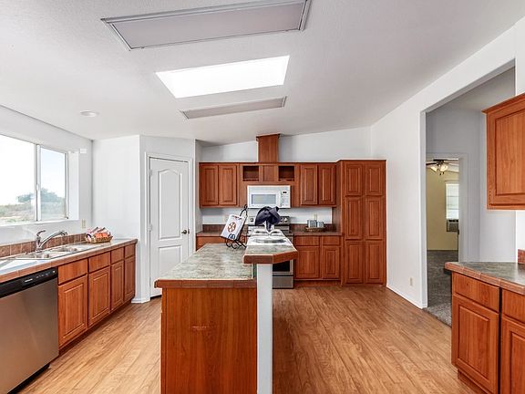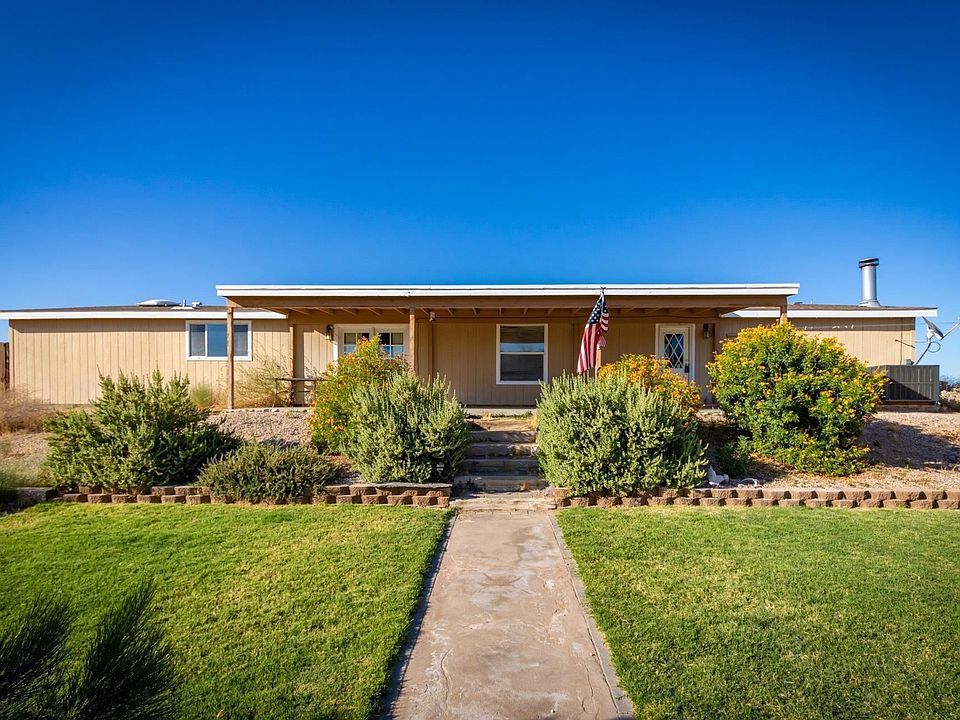 Desert Gem on 1.667 acres with private well! Welcoming entrance with large covered patio and grassy front yard. Open plan with new stainless steel range/oven, dishwasher, & refrigerator, an abundance of cabinets, breakfast bar, & walk-in pantry in kitchen. Vaulted ceiling in great room, large bonus room with barn door, new engineered hard wood flooring & cozy fireplace & an additional space perfect for a 4th bedroom, play room or study area. Separate den/office with built-in desk, 3 spacious bedrooms, 2 full baths. New carpet & interior paint, 2 new 3 ton A/C units, new pump & pressure tank on well 2 yrs ago. 2 Car detached garage with 220 power. Backyard features a beautiful sparkling pool with newer Wet Edge polished finish, motor & pump, block fence for privacy. Horses welcome!