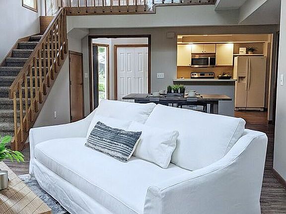 Lovable lofted 2 bedroom, 2 bath on semi private lot. Just refreshed with new vinyl plank on most of the main level, carpet on steps, loft and up BR. and tasteful paint throughout. Master has hardwood and direct access to the large closet and bath. A corner gas fireplace in the Great Room with strong vault that soars to the 19x10 loft area with skylight. Both bedrooms have windows that give a view of the wooded backdrop behind the home. Patio off GR to enjoy the scenic seclusion of natures beauty. 24x24 oversized two car garage. Washer/dryer provided. Jefferson Place is one of the very few condominiums developments that include maintenance of the roof and exterior of the homes in the association fee. Also includes snow removal, sprinkler system, lawn care, trimming shrubs and trash collection. You will enjoy the pool, basketball court and miles of walking trails and is close to all the amenities you could possibility want or need. Close access to I-69, Lutheran Hospital, bike trails and the association pool.