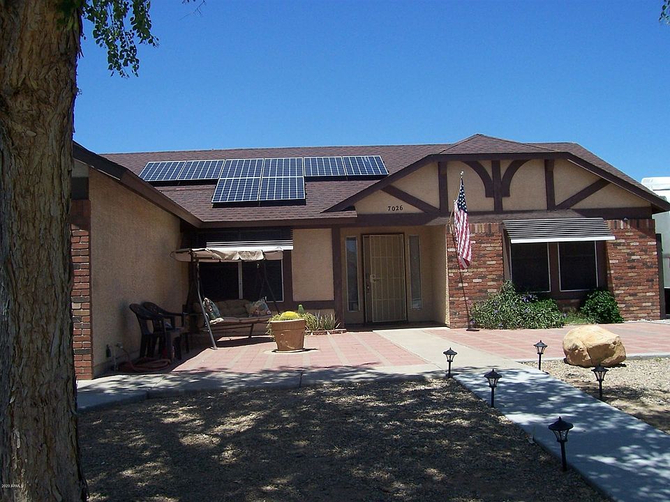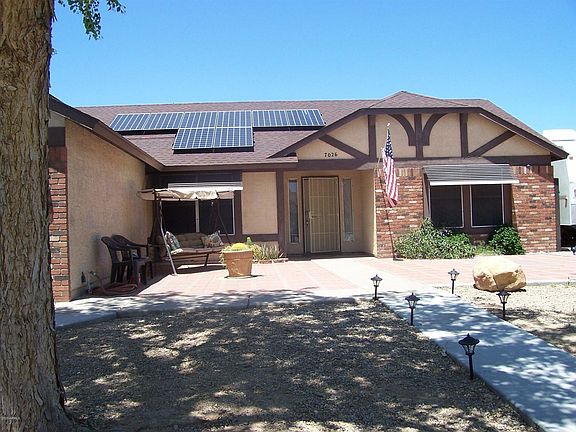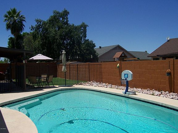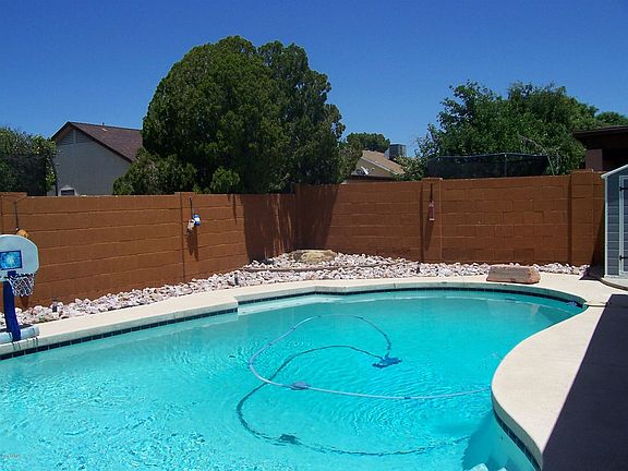Bricked front courtyard welcomes you to this 3 bedroom, 2 bath home, with diving pool. Great room/dining room with vaulted ceilings, sliding glass door to patio. Eat-in kitchen, white cabinets, stainless appliances. Laminate flooring in kitchen, dining area, baths, laundry, & hallways, carpeting in greatroom & bedrooms. Master bedroom/split floor plan, with vaulted ceiling and sliding glass door to backyard & large covered patio. Fenced diving pool (diving board has been removed & won't be replaced). RV gate & large slab extending length of home, on west side, possible RV parking on east side. No HOA. Easy access to the 101, Arrowhead Mall, and the Westgate Entertainment & Sports Arenas.
