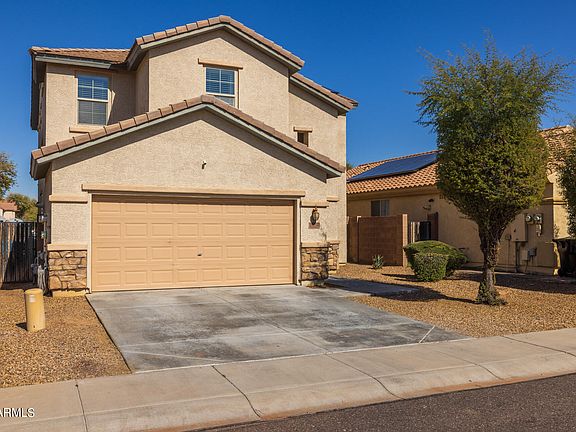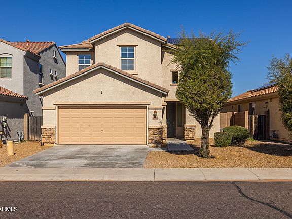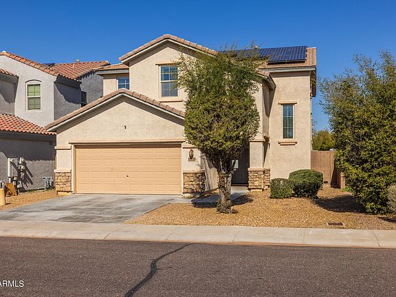 Welcome to this gorgeous home in Laveen Meadows! This home has a well-designed great room layout with 3 bedrooms, a downstairs office, a loft, 3 bathrooms, and a refreshing pool! Save on electric bills with fully owned solar panels! As you enter the home you will love the dramatic ceilings and beautiful iron staircase. The recently remodeled kitchen is stunning with beautiful cabinets that have pullout shelves and soft close, Quartz countertops,a stylish backsplash, stainless steel appliances, a walk-in pantry, and a kitchen island with a breakfast bar. Through the sliding glass door you'll find a covered patio with a ceiling fan, and a beautiful view of the community. The pool has a travertine deck! Upstairs is a spacious loft and the bedrooms. The primary suite is generous in size with a lavish ensuite bathroom featuring a dual sink vanity, a separate shower and bathtub, and a huge walk-in closet! Bedrooms 2 and 3 are spotless and move-in ready! The laundry room has upper and lower cabinets for additional storage. This well-maintained home is gorgeous, you do not want to miss out!