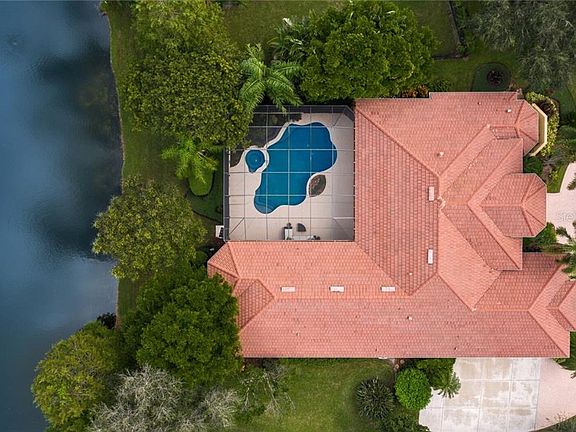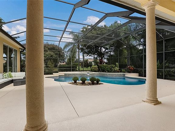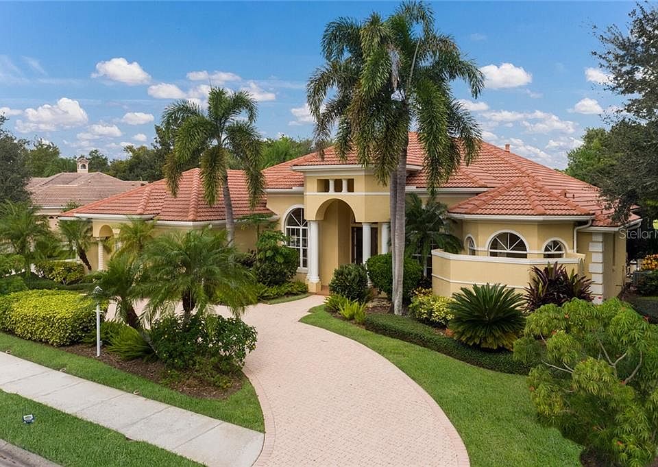 The exclusive Canterbury subdivision of Lakewood Ranch Country Club is characterized by its larger lots and exquisite homes, and this 3,877 square foot custom residence is no exception. Mature foliage on the nearly half-acre lot, a freshly painted exterior, and a circular drive give the home impeccable curb appeal only enhanced when greeted by large French doors with transom windows. Inside soaring tray and coffered ceilings, keystone columns, and tile flooring with marble inlays accentuate a thoughtful floorplan that effortlessly transitions from indoors to out. The living room with beautiful stone fireplace, custom built-ins and floor-to-ceiling glass sliders to the lanai is the perfect introduction to the evident quality of the home. A spacious kitchen with stone counters, rich wood cabinetry, breakfast nook with aquarium glass, expansive breakfast bar and walk-in pantry is a central hub, connecting beautifully to a family room and formal dining room via a Butler's pantry with wet bar and wine cooler for effortless entertaining. Beyond the family room, a bonus room (currently outfitted as a fourth bedroom) is prewired for a media room and is a versatile space. Meanwhile a second oversized bonus room, ideal as game room is connected to the pool area. Retreat into the owner's suite with expansive bay windows, walk-in closets, and divine spa bath with Roman shower and glorious soaking tub. Guest bedrooms are generous in size and an office toward the front of the home is perfect for remote work. One of the show stopping elements of the home is the serene playscape of the fully enclosed lanai. Enjoy lazy weekends and a full Florida experience right at home with an oversized pool that overlooks the lake and tropical greenery, spa, covered areas and the pre-plumbed space for a summer kitchen. Additional features of note is the three-car, side-load garage and laundry room. All on one story and brimming with potential to create your ultimate Florida home just moments from premier shopping and dining, SRQ Airport and a short drive to world-famous beaches.