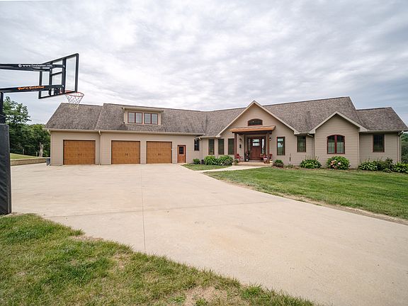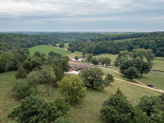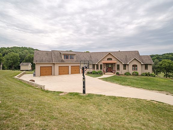 This property checks all the boxes. It is located just 10 minutes from downtown Galena and 20 minutes from Dubuque, IA. It is a rare offering and one of the most picturesque settings in its locale. The private and convenient retreat is boarded by Hunting land and Timber on all sides. It has incredible views and sounds of the Sinsinawa River that runs through it. The valley topography in this acreage consists of a combination of flat cropland, hills, and pastures perfect for a farmer's needs or a sportsman's dream. This property is truly anyone's retreat! The acreage is loaded with wildlife, including whitetail deer, wild turkey, ducks, and geese. Great fishing includes a variety of fish with an abundance of small-mouth bass. An enormous eagle nest is situated within direct view of the home's living area. A mated pair inhabits the nest and provides year-round viewing. You will find both seclusion and beautiful views of an expansive valley surrounded by wooded hills as you enter the property. The entrance of the property has a 30x36 outbuilding for machinery and an enclosed chicken coop with a run. The custom-built home that was architecturally designed to optimize the river and landscape views rests at the top of the lane. This 4000+ sq ft ranch home provides 4 bedrooms, 5.5 bathrooms, and ¾ inch hardwood floors. Entering the home, one's eyes are immediately drawn to the large open floor plan and the captivating views of the Sinsinawa River valley. The open flow living room features a spectacular ledgestone wall, a Heatilator wood-burning fireplace, and a half bathroom. The adjoining kitchen has stainless steel appliances with a massive granite island perfect for entertaining. A kitchen nook with a view, a formal dining room, and an oversized pantry completes this area. An oversized screened-in three-season porch and a maintenance-free deck with railing provide additional living and entertaining space to the main level. The laundry and mudroom with built-in lockers provide easy access to the attached three-car garage, which has in-floor heat. The main floor master bedroom has tray ceilings and a large master bathroom. The Master bath has separate his and her sinks with granite countertops, a large tiled shower, and a deep soaker tub that allows one to relax and take in with views of the property. Two separate large walk-in closets and a linen closet provide ample storage. Above the three-car garage and accessible from the main floor is an office and separate gym area. This space includes a full bathroom and kitchenette and is beautifully finished with hardwood floors, built-ins, and granite countertops. The area could also make a great mother-in-law suite. The lower level is a walkout with heated floors. A wet bar with built-ins and a large granite island opens into another stunning living area with an adjoining game room. Three oversized bedrooms are on this level - two of which have walk-in closets and on-suite bathrooms with tiled showers. Another full bathroom and a laundry room complete the lower level. The property has infrastructure for your livestock operation. It's equipped with a 31x36 Lean and a 24x32 field barn. There are fenced pastures, cattle guards, and 37+/- acres of tillable ground. Currently, there are 20 acres in alfalfa and 17+ acres in corn. Approximately 100 acres of Timberland and an established trail system provide ATV and hiking enjoyment.