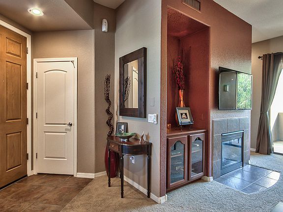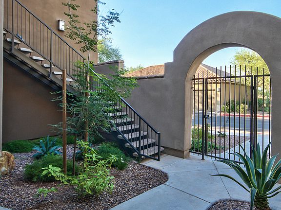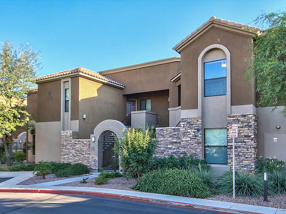 Fantastic location, 1 car garage, and a Paradise Valley address!!! This beautiful 2 bedroom 2 bathroom gated upscale condo has everything a condo owner could ask for. Living in Traviata is so convenient being within walking distance of great shopping, dining, golf courses, parks, and so many other amenities. This 2nd level condo has no neighbor above so you'll enjoy the benefits of higher 9 ft ceilings and no noise from above. The 1 car detached garage is conveniently located and a great feature with lots of storage potential. This great room floor plan is very open and bright with a beautiful gas fireplace and access to the covered patio with views of the common area. The kitchen features stainless steel appliances, staggered cabinetry, and granite counter-tops.