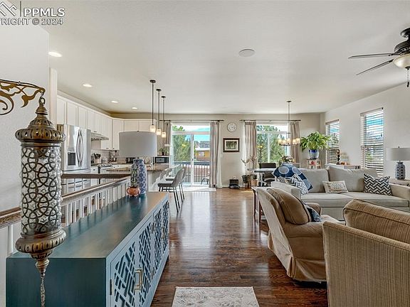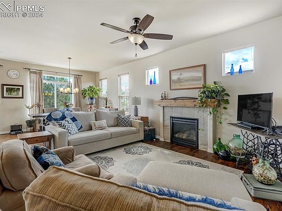 Welcome Home to this bright and airy 4 bedroom/ 3 bathroom Rancher nestled in highly desirable Cumbre Vista, conveniently located near St. Francis Penrose Hospital. As you enter, you'll notice the beautiful hardwood floors and bright, open floor plan. Off the front entry, there is a well appointed guest bedroom and full bathroom. The main living area is wonderful for entertaining with the living room, dining, and kitchen all open to each other. The living room features a gas fireplace and 10 ft ceilings making the space feel large and spacious. The upgraded kitchen has gorgeous granite counters, 42" maple cabinetry, stainless steel appliances, an island with breakfast bar seating and walks out to the back deck. Finishing off the main level is the primary suite featuring a 5 piece en suite with walk in shower, large soaking tub, granite counter double vanity and large walk in closet. Moving down to the garden level basement, there is a large family room with space for the entire family and pre-plumbed for a wet bar. The basement also features two large bedrooms, a full bathroom, and large unfinished storage room. Out back you'll find a 6' tall private fenced backyard with a 10' x 8' wood deck overlooking the striking view of Pikes Peak, a large concrete patio for your grill station, and beautiful landscaping that provides a perfect place for your pets or little ones to play. As an added bonus, the 2 1/2 car garage is oversized providing extra storage for household items and off the garage entry is the convenient main level laundry. This home has also been upgraded with central A/C in 2022 and a brand new roof in 2024. This property's location is ideal, with proximity to top-rated District 20 schools, shopping, dining, and hospitals, ensuring convenience and accessibility. Overall, this home epitomizes comfortable Colorado living, blending style, functionality, and breathtaking views. Schedule your showing today!