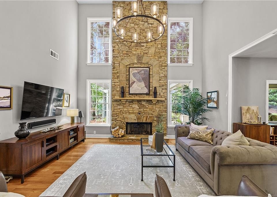 ENJOY PEACEFUL OUTDOOR LIVING WITH GOLF COURSE VIEWS AND CUSTOM WATER FALL FEATURE FROM YOUR SCREENED IN PORCH! LOCATED ON THE 4TH HOLE, THIS HOME FEATURES AN UPDATED, WELL-EQUIPPED KITCHEN, OVERSIZED PRIMARY SUITE, AND LUSH LANDSCAPING. IDEALLY LOCATED IN A TOP- RATED SCHOOL DISTRICT AND GREAT PROXIMITY TO HALCYON, THE COLLECTION, MARKETPLACE, CUMMING CITY CENTER and AVALON. Throughout the home you'll find a neutral color palette, hardwood flooring, and updated lighting. Soaring ceilings in the family room allow for plenty of natural light and a floor-to-ceiling stone fireplace. The kitchen has newer white cabinetry, stone countertops, newer appliances and a large island. A guest suite on the main level offers pretty views of the backyard and golf course as well as a full bathroom. Rounding out the main floor is a formal dining room and a formal living room that could easily be used as an office. Upstairs are four large bedrooms including the primary suite. The suite's high ceilings, separate sitting area, generously sized closet with custom organizers, and bathroom with new quartz countertops make it the perfect place to retreat and unwind at the end of a busy day. A well-manicured backyard features mature landscaping with lighting, WIFI-enabled irrigation, wrought-iron fencing, a pond with a waterfall, and a stone patio covered by a pergola. Unlike many homes in the area, this home features a flat lot with plenty of room for playing or gardening. This home has been well-maintained and includes a whole-home surge protector and updated HVAC that includes a separate zone for the primary suite. This is an excellent opportunity to take advantage of the country club lifestyle Windermere offers at a great value. Enjoy the swim, tennis, golf community that also includes pickleball, basketball and a full time activities director! There is always something going on in Windermere, fun for all ages! Great parks, dog parks and Big Creek Greenway are all nearby. Commuters will appreciate easy access to Peachtree Pkwy, GA 400, and HWY 20.