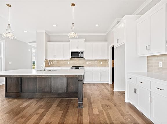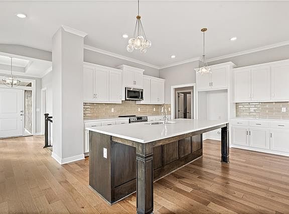 MOVE IN READY! Moorefield Reverse W/Mediterranean elevation by Award Winning Summit Homes. Open plan with Designer Kitchen featuring Granite Counters, Large Island, Stainless Appliances, & Pantry. Great Room features include Fireplace with Stone Front, Soaring Ceilings, & Lots of Glass for a Light, Open feel. The Main Bedroom Suite includes a Vaulted Ceiling and Walk-In Closet plus the Main Bath with Fully Tiled Shower, Granite Counter, & Double Vanity. The Walkout, Finished Lower Level includes 2 Bedrooms, a Full Bath, & a Spacious Rec Room. Unique Double Deck Design for lots of outdoor entertaining space. Summit Homes provides an industry-best, 10 Year Warranty for the new owner. File Foto of Former Model