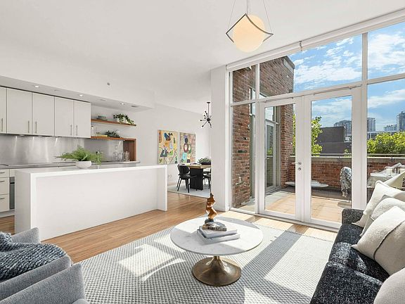 Discover the penthouse lifestyle at the historic Terminus Building with your own expansive, 360 degree view rooftop deck. Developed by Salient Developments, specializing in heritage conversions, the architecture and attention to detail reflects modern design often used in European restorations. This 2 bedroom and 2 bathroom home spans 1202 sq ft with an additional 988 sq ft of outdoor space, including a walk out deck enveloped in reclaimed brick and the spacious rooftop deck with an outdoor kitchen and panoramic views of historic Gastown, the ocean, city, and mountains. Outside, watch it all pass you by with floats planes and helicopters taking off and landing, or the cruise ships coming and going. The open concept interior is bathed in the warm glow of natural light, from full height windows and nearly 10ft ceilings, flooding the space with an airy, light feel. Find a luxurious spa ensuite in the primary bedroom. A sun-dappled garden and brick wall are framed by the window in each bedroom. Modern amenities include geothermal heating and cooling, heated bathroom floors, outdoor areas include gas bibs, built-in sound system, 2 parking stalls & a storage locker.