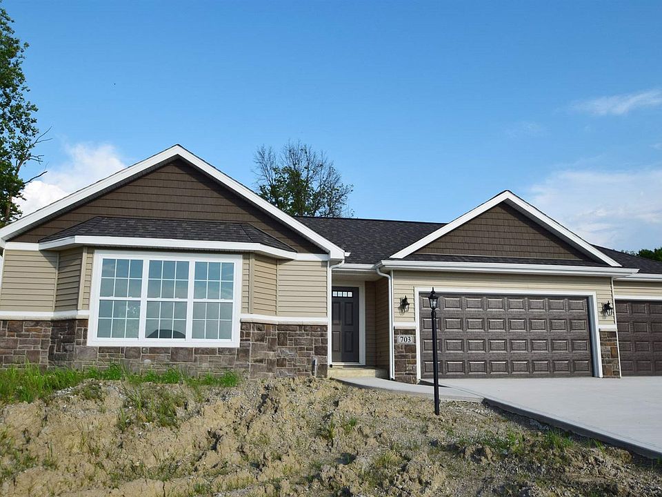 Lancia's modified Brittany plan has larger footage at 1683 sq.ft., is a 3BDR Ranch on a 963 sq.ft. unfinished Daylight PARTIAL Basement, 3-Car Garage, 14 x 10 deck, 10 x 12 Patio, pie-shape lot on a cul-de-sac. Partial daylight basement is unfinished with 963 sq.ft. with tile sump pump line. Foyer opens to Great Room with cathedral ceiling with paddle fan. Half wall give a view of Kitchen and Nook. Nook has sliding doors leading to deck and stairs to Patio below. Kitchen has breakfast bar, ceramic back splash, stainless appliances, smooth top range, addl gas line, separate Utility Room and linen closet. Closet Tamer shelving, upgraded faucets and 2-panel doors throughout home. Pride laminate flooring in Foyer, front hall, Kitchen, Nook, Baths and Utility Room. Master Bdr is 16x14, dual rod & shelf 1-wall unit in Master walk-in closet, Master Bath has dual sink vanity, linen closet and 5' shower. Both Bdr 2 and 3 also have walk-in closets. Addl foam insulation on exterior walls of living space. Home has Simplx Smart Home Technology - Control panel, up to 4 door sensors, motion, LED bulbs throughout, USB port built-in charger in places. Garage has attic access with pull-down stairs and 2 sheets of OSB board. Stone, vinyl shakes, gables and dimensional shingles on exterior. 2-year foundation to roof guarantee and an in-house Service Dept. (Grading and seeding completed after closing per Lancia's lawn schedule.)
