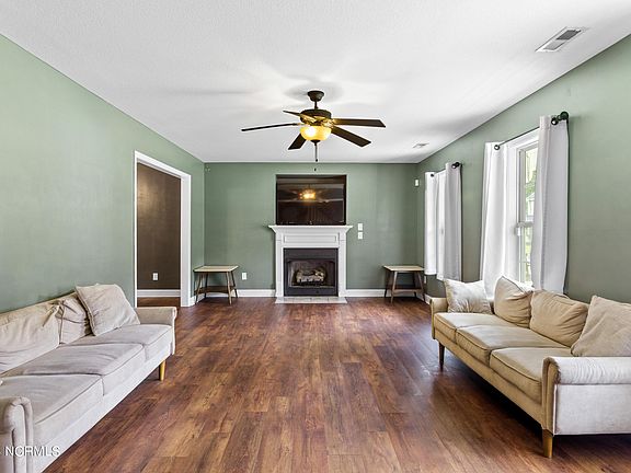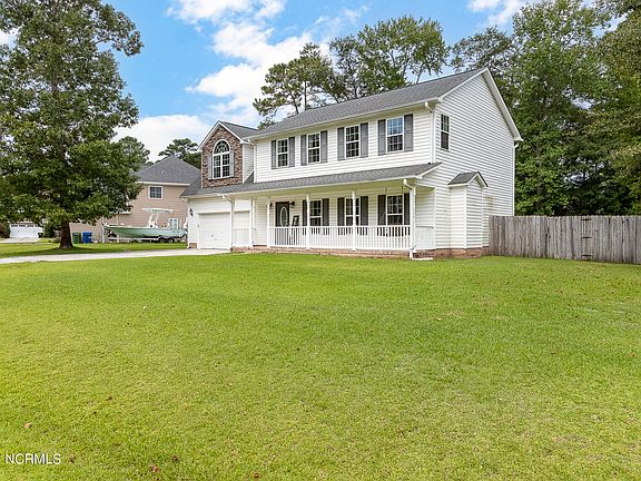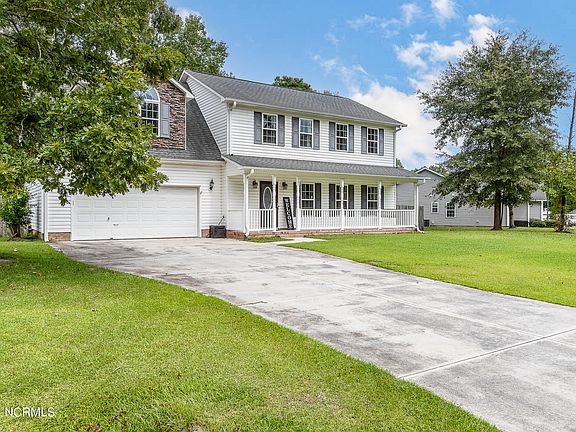 This immaculate home is nestled in the thoughtfully designed Blue Creek Estates and has all the amenities you can imagine! You're instantly drawn in by the stone work, mature landscaping and well maintained front yard. Imagine sitting in rocking chairs as the sun sets this winter. As you enter the home, take notice of the oversized foyer. You'll have plenty of space for a true southern greeting with room to hug your guests and take their coats! To the right of the entrance is the large living room featuring a fireplace that will come in handy on chilly winter evenings. Head upstairs to find the primary suite with dual vanity, vaulted ceiling and YES.. a walk in closet! The second floor also has three additional bedrooms, one of which is BIGGER than the master bedroom!! Yep, you heard that right! Sharing a room never looked better! You'll never run out of room for storage in this spacious and well crafted home. Head back down stairs and take a moment to enjoy the upgraded kitchen with stainless appliances, custom tile back splash, and breakfast nook with a bay window. Enjoy formal dinners in the dining room before stepping out onto a huge back deck great for entertaining or relaxing. The back yard is enormous and there's nothing but nature behind your fenced back yard. This home is on sewer, so no need to worry about a septic tank. This home is less than 2 miles from the bypass, and only minutes from New River Air Station, Camp Lejeune, local beaches, shopping and restaurants. Welcome to city convenience, without having to pay city taxes. Call me today to schedule your private showing!