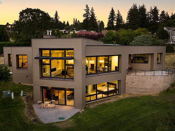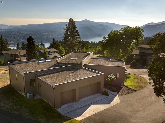 Introducing a captivating modern property that offers the ultimate blend of natural beauty and contemporary design. Walking distance to downtown restaurants, this stunning home boasts unobstructed views of the majestic Columbia River Gorge as it stretches westward, providing an ever changing canvas, with sunsets that paint the sky. Gaze south to Mt Hood and The Hood River lights in the nights sky. With a sweeping floor plan of 4 bedrooms, 3 1/2 bathrooms along with an additional office, bonus space downstairs and additional living quarters, complete with a full kitchen, this property is designed to serve your every need. Sun shades throughout this home with 12' ceilings and 9' doorways. The luxury finishes and unique architecture fuses with the awe inspiring scenery beyond. Don't miss the high end appliance options with gas stove top, ex fridge/freezer space and more. Exceptional outdoor living spaces including the elevated outdoor patio to sip your morning coffee as river glows with morning sun. A second designated outdoor patio off the lower level. Walk-out to enjoy morning shade and afternoon sun with full views! Plenty of room to host and enjoy multigenerational living. The private and paved road entrance, with trees and scenery, creates ease as you approach the extended three-car garage and main level entry. Experience convenience as you enter the thoughtfully designed mudroom and laundry off the garage on the main level. Additional office space and drop zone as well as pantry storage. Abundant storage solutions throughout this home including built-ins, closet space and under stairway storage. Surround sound and security features inside and outside this well appointed home. The yard includes ease with modern landscape and full coverage in-ground sprinklers. Enjoy two cherry and one pear tree out your back door! This residence truly embodies the essence of Pacific Northwest Living.