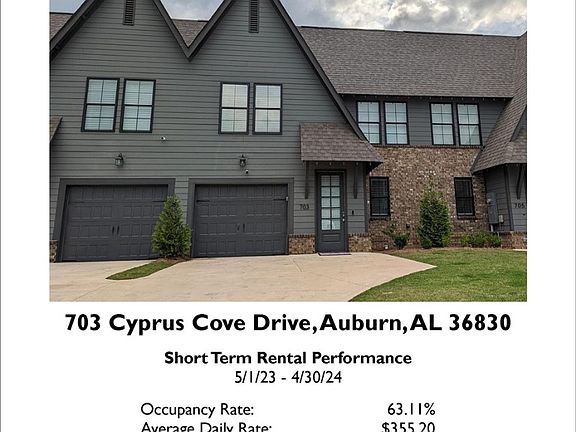 HIGHLY PROFITABLE AIRBNB + STUDENT HOUSING APPROVED! Nestled near the Auburn airport, this luxurious 4 bedroom, 3.5 bathroom newly constructed townhome presents a prime investment opportunity. Generating an impressive $108,473 in revenue over the past 12 months at a 63% occupancy rate, this property has proven its worth. With an average monthly income of $9,039, this townhome is not only a financial asset but also a versatile accommodation option, approved for both student housing and short-term rentals—a rarity in Auburn. The property features high-end finishes and modern amenities, including a full suite of designer furniture valued at $60k. This location offers easy access to Auburn University, local games, and vibrant downtown life. Upcoming bookings are already in place, proving demand and ready for new owners looking to capitalize on this turnkey investment.