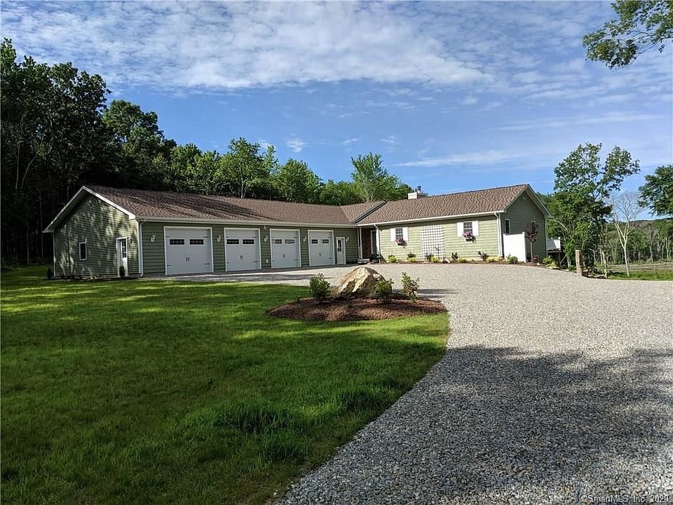 NATURE LOVERS DREAM! 17.5 acres of privacy, peace and beauty come together in this brand new spacious 2080 sq ft beautifully landscaped 3 bedroom, 3 bath ranch, with an open floor plan, 32 X 60 4 bay attached garage w/half bath, kitchen offers granite countertop, new stainless appliances, tiled kitchen floor, gleaming hardwood floors in living room/dining area and bedrooms, gas fireplace, central air, generator hookup, additional 1120 sq foot finished off lower level w/waterproof laminate flooring, 2 laundry rooms, one on main floor one in LL, enjoy the view of your own pond from the 14 X 68 deck. Hartford Road is Route 85, close to Route 2 for easy travel to Hartford. Horse friendly! Please check with the town for accurate taxes.