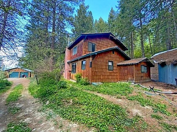 Shady Cedar Cabin on 5 acres with views of the valley. This cozy cabin has mountain views and Highway 1 frontage for easy access. Property features sloped and wooded acreage bordering USFS land, a circular driveway, detached 2 car garage, multiple storage buildings, a new septic system, and private 20 gpm well. 1884 sq ft, 3 bdrm, 2 bath home to make your own. Main Floor laundry hook ups, 2 enclosed mudroom/sun porches, pellet stove, and fireplace. Current heat used is forced air oil furnace. Second bdrm on main floor has laundry hookups and is being used for storage. No ccrs and easy access.