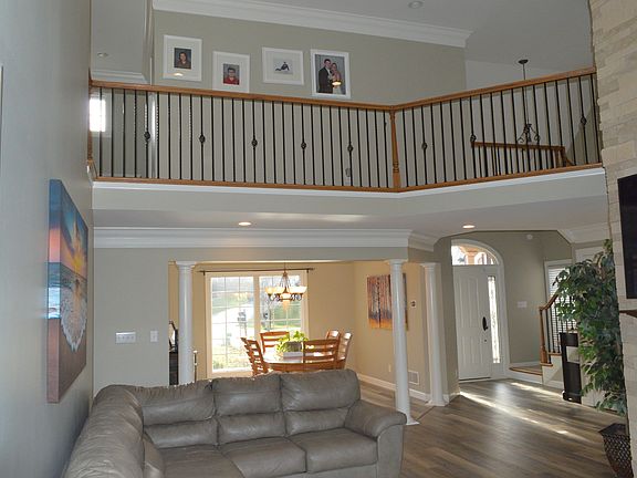 A Very Open floor plan with finished walk out, over 4100 finished square feet. Private cul-de-sac lot with wooded open space behind it! Freshly painted Lower level has Theater room, family room, gas fireplace, guest bedroom, exercise room, full bath and a Huge 14x 30 built in utility room with walk out. The first floor has all new floors, an open dining room, crown molding, floor to ceiling stone fireplace, newly remodeled first floor master bedroom/bath, remodeled laundry room and office. Large eat in kitchen with granite countertops, new stainless steel appliances and freshly painted white cabinets. The second floor has three nice size bedrooms, freshly painted full bath and a kids' activity room. There is a nice deck off the kitchen overlooking the private back yard.