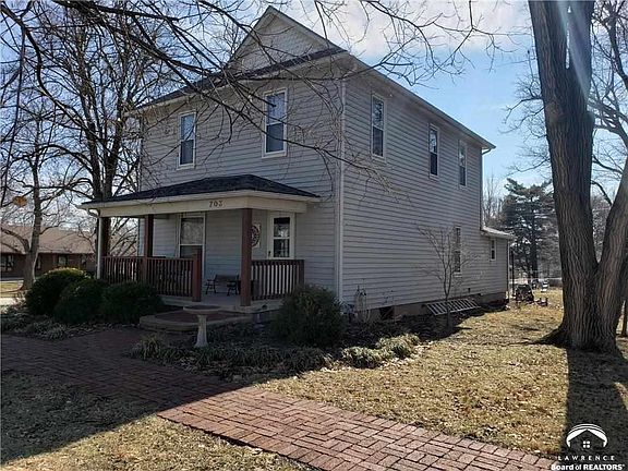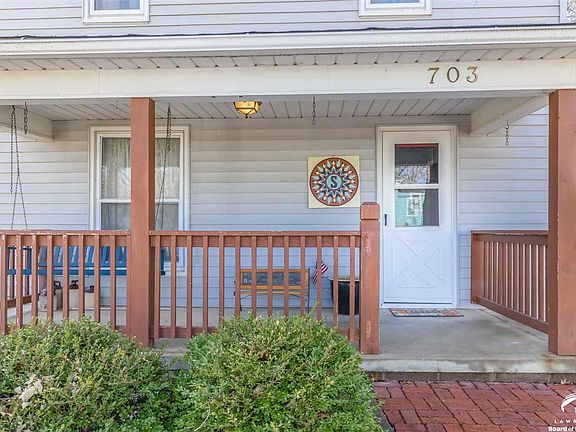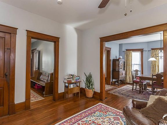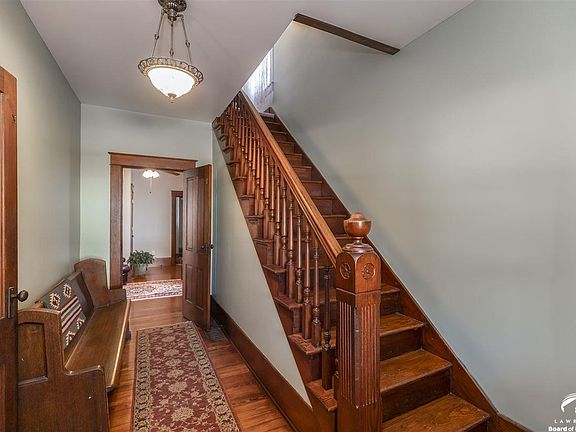 Yesteryear charm with all modern conveniences in this beautifully restored 4 bdrm 2 ba hm w/maintenance free siding on lg corner lot*Frt porch & swing*Updated kitchen with new appliances & backsplash*Spectacular original woodwork, solid panel doors, hardwood floors, French doors from liv rm to formal din rm, parlor off entry w/gorgeous staircase leading to upper level bdrms w/new carpet & ceiling fans, full bath w/deep corner tub & shower*Main flr laundry*Deck**Newer roof*New wiring*Added insulation. New 36 x 24 garage and shop in 2022.