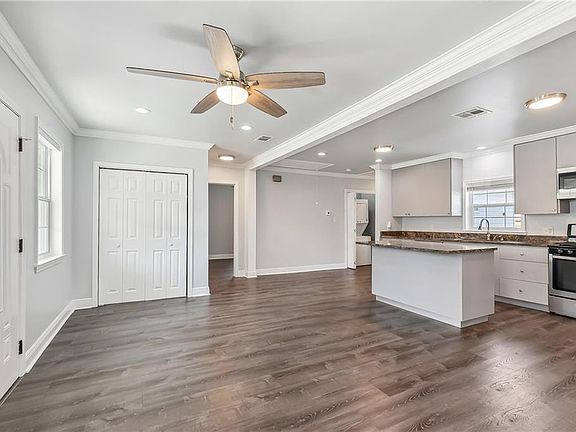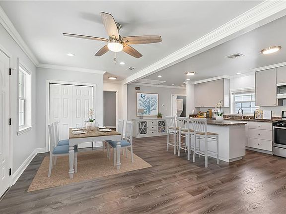Charming raised cottage-style home with gorgeous updates throughout. The inviting living room opens to an updated kitchen featuring a movable island, granite countertops, stainless steel appliances, and vinyl plank flooring (no carpet). There is a side entrance door from the kitchen that leads to a spacious backyard with rear access, a storage shed, and a covered area. HVAC replaced in 2019, roof replaced in 2021. Low, assumable flood insurance. Don't miss out on an incredible opportunity. Make an appointment today!