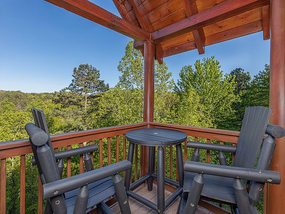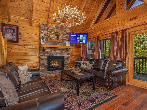 High Rental Income Producer ($135k 2021) with amazing tree top views in the gated Sherwood Forest community minutes from Dollywood & other attractions! Stunning 3-level, 4 bedroom, 3 bath log cabin. Theatre room boasts of brand new 75” Smart Roku TV and row of new floor rockers (seats 9!). High ceilings, hardwood floors throughout & stone gas log fireplace! Loft bedroom has remote-controlled electric fireplace that can be used to heat or for ambiance. Private hot tub on balcony with views & access to community pool! New exterior light fixtures (black/gooseneck with Edison lights) & new rocking chairs at main level. Nest exterior cameras can transfer to new owner. Books all year. Owner managed. All furniture, holiday décor and contents convey. Airbnb link: airbnb.com/h/happy-ours