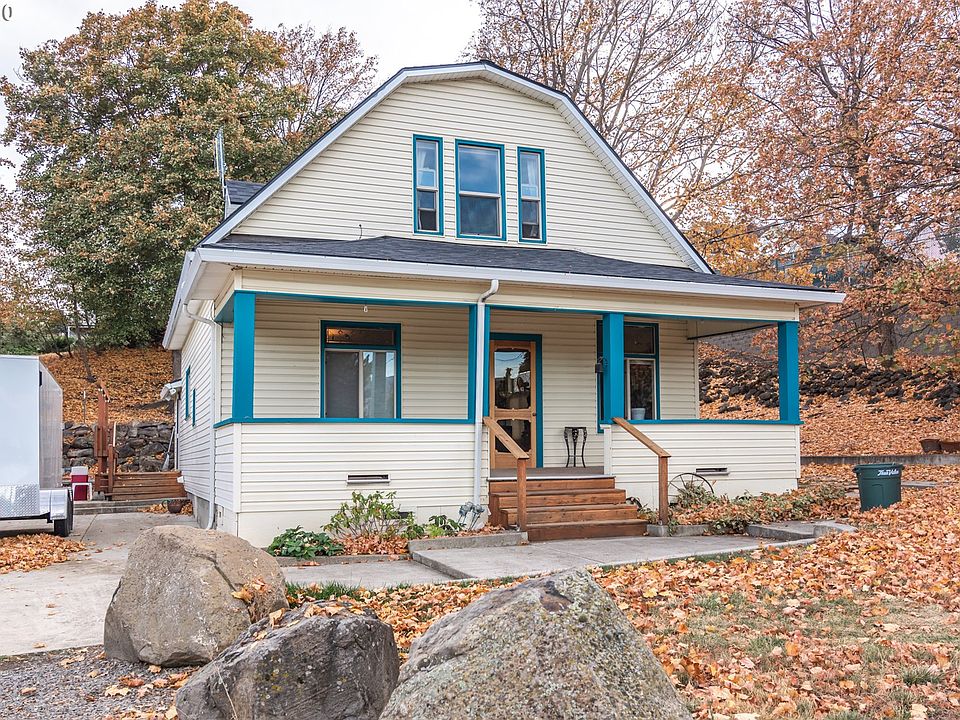 Farm style home in the city limits of La Grande, OR. 4 bdrm/2 bathrm historic home w/2 levels. Set on .9 acre & dividable with city services. Very private setting with extra large parking area and 864 sf double door shop. Charming knotty pine in some rooms plus updated windows and new roof. Cozy front porch looking out to Mt. Emily and fashion cold storage cellar. A private patio and decks for enjoying the outdoors. Please come discover this unusual opportunity to own almost an acre home site.