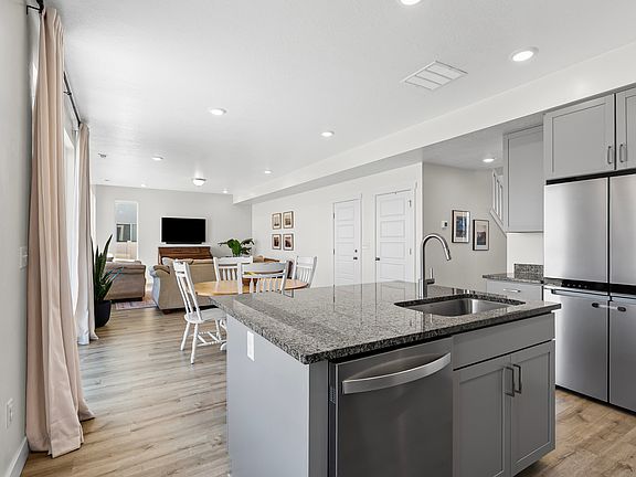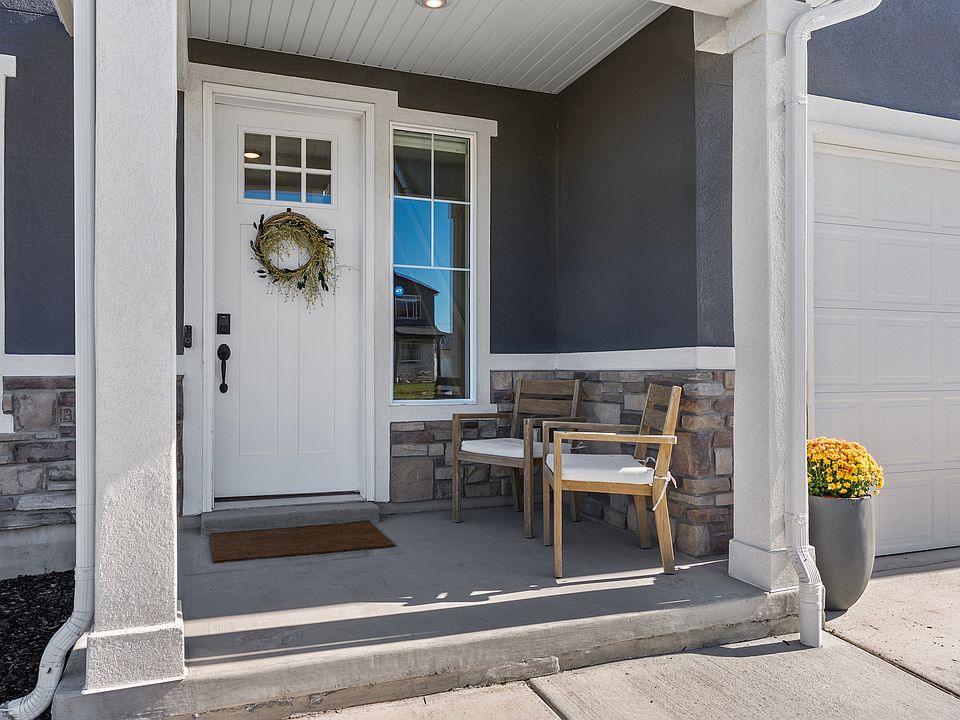 Built in 2022, this charming 4-bedroom, 2.5-bath home combines modern comfort with timeless style on a desirable corner lot. Enjoy a beautifully landscaped front yard with rose bushes, and a fully finished garage. The west-facing orientation provides warm afternoon light for easy driveway snow melt, and a perfectly shaded private patio for a relaxing evening taking in the panoramic mountain views. Inside through the large sliding doors, luxury vinyl plank flooring, open railings, and thoughtful design create a bright, airy feel. The main floor features a 4th bedroom with double doors and a convenient half bath. Upstairs, the flexible loft space can easily convert to another bedroom or media area, and every bedroom offers a walk-in closet. The spacious primary suite is a true retreat with room to unwind, mountain views, and a large ensuite bath. Granite countertops, plush carpet, and upstairs laundry add everyday convenience to this well-designed home. Located near schools, parks, and shopping, this home is perfect for those seeking modern living, smart spaces, and easy maintenance. Come see why this American Fork gem feels like home!