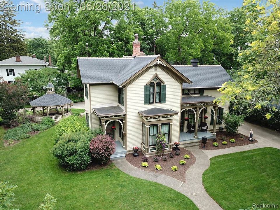 Beautiful 1860 Victorian Home On the main floor you will find a formal dining room with crystal chandelier, parlor featuring gas fireplace, den with pressed tin ceiling, office, Sunday parlor, granite kitchen countertops, Heartland stove & hardwood flooring throughout! As you walk through the French doors into the foyer you will see the stunning winding staircase leading you to 3 bedrooms, a full bath and laundry! Outside is a 3 car carriage house with natural gas access and lots of storage space in the loft. This spacious corner lot features beautiful landscaping, a relaxing gazebo and water fountain. Boiler 2015, new roof 2019, water heater 2020. Walking distance to downtown Fenton! BATVI