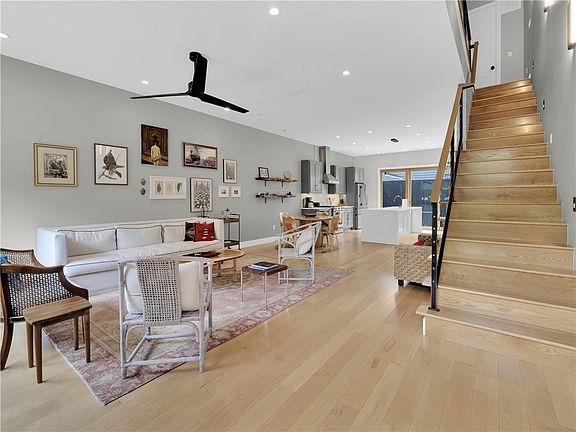 Interior features include Quartz countertops, stainless steel gas appliances, Pella windows, Hickory hardwood flooring, and floating vanities in all bathrooms. The open-concept main level is ideal for entertaining, while both upstairs bedrooms offer en-suite baths and ample natural light.