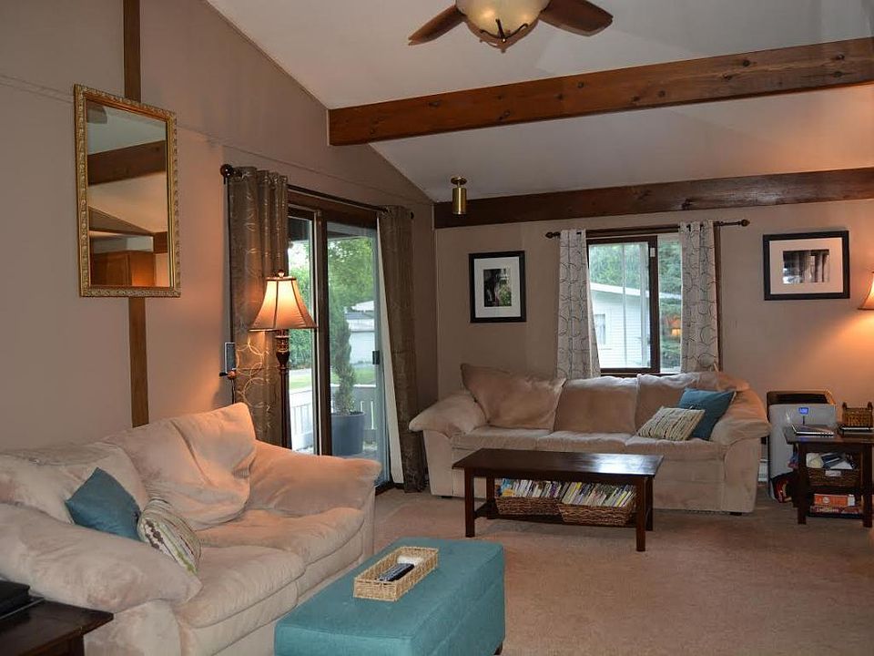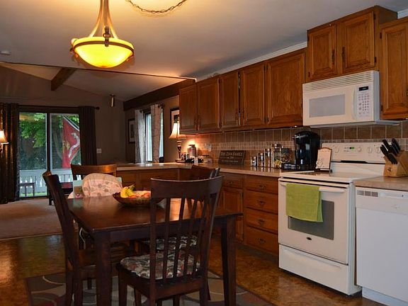 Absolutely Adorable 2 bedroom 1 bath home with mature trees on largest lot in the development!Large kitchen with eat in dinette area open to the great room complete with wood fireplace!Laundry room boasts front load washer and dryer with counter on top! Both bedrooms are oversized. This affordable home has a crawl space! This community offers indoor heated pool, newer shelter building, park! Must see Inside! Won't last long! Call Today ! Motivated Seller. Per seller home qualifies for Rural Development Program for financing.