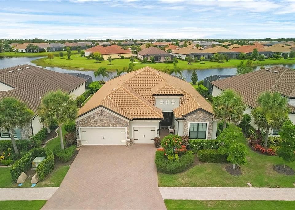 COUNTRY CLUB EAST in Lakewood Ranch the best in resort living awaits in this beautifully designed Summerville model with Southwestern exposure on almost one quarter acre with tranquil waterviews.  No expense was spared designing this home with so many custom features including one of the most beautiful feature walls to enjoy your favorite movie or TV show with electric color changing fireplace and up-lighting in the expansive great room... the centerpiece of the home.  Brand New 18 seer York A/C was installed July 2023.  The most popular Summerville floorplan flows beautifully with a kitchen that is designed for entertaining and will appeal to the chef of the family,  featuring an expansive breakfast bar, tile backsplash, built in smart GE Profile oven with recipe settings, convection setting, air fryer and so much more. The kitchen, dining room, and greatroom  flow seamlessly for the best in Florida living.  Three bedrooms all in separate areas for the ultimate privacy,  plus den/office with double glass doors, three full baths, including en-suite bedroom with full bath.  Primary bedroom features two custom walk-in closets with built in dressers, custom shelving, bath with soaking tub, large glass enclosed shower, and dual vanities complete with decorator lighting. So many designer features including lighting and fans throughout the entire home, plantation shutters and window treatments.  Stone countertops in kitchen and all 3 baths. IMPACT GLASS WINDOWS throughout and remote control power operated storm shade for covered lanai, heated saltwater pool, spa, outdoor lighting, professionally landscaped. Porcelain tile flooring throughout - no carpet.  Outdoor kitchen features Bull refrigerator and natural gas grill with plently of counter space for your outdoor meals under the covered lanai. Country Club East, a private gated community, offers its residents three amenity centers including the Retreat with clubhouse, resort pool,  fitness center, Residents Club with clubroom, pool and heated spa, and third neighborhood  pool. Opportunites are available to become members of Lakewood Ranch Golf and Country Club featuring 3 clubhouses for dining and social events, Golf,  tennis, pickleball, swimming pool,  and state of the art athletic center. Country Club East Lakewood Ranch is conveniently located near exceptional shopping, dining, A rated schools, and a short drive to the beautiful gulf beaches. Don’t miss this rare opportunity to live in exceptional luxury. CHECK OUT THE 3D HOME TOUR AND WALK THROUGH THIS MAGNIFICENT HOME