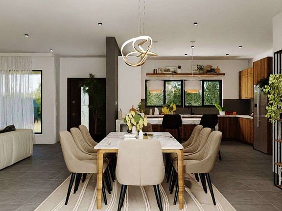 Completed documentation includes approved San Bernardino County construction drawings for a main residence, encompassing architectural, structural, and plumbing plans, along with final grading and drainage plans, a soils report, percolation report, survey, and a Title 24 energy report. Conceptual renderings illustrate a modern desert design that complements the surrounding landscape while emphasizing indoor-outdoor living.