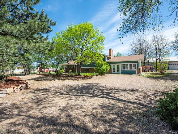 Country living on 5 acres close to town, unincorporated Weld county west of Firestone. Beautifully updated Tri-level featuring 3 bedrooms, 3 bathrooms, living room, family room, wood burning fireplace, office space and beautiful hardwood floors. This home also features an additional living space with full kitchen, full bath, open to the bedroom and living room. Great for a mother in law, rental, airbnb or studio space. This home has a brand new roof, new exterior paint, new skylights on the 2 covered patios. Central Air condition, newer furnace, upgraded septic system, gas line for outdoor kitchen and drip system in the garden beds. Fenced yard, chicken coop, storage shed. Zoned for horses with a fenced pasture. A 1200+ sq ft steel structure shop with updated electrical features a 300sq ft loft as well as 14x45ft overhang for RV parking or storage. Minutes from grocery store, restaurants, schools, local library, golf courses and so much more! No HOA, No metro tax. Come see!!!!