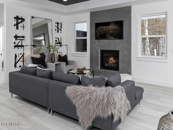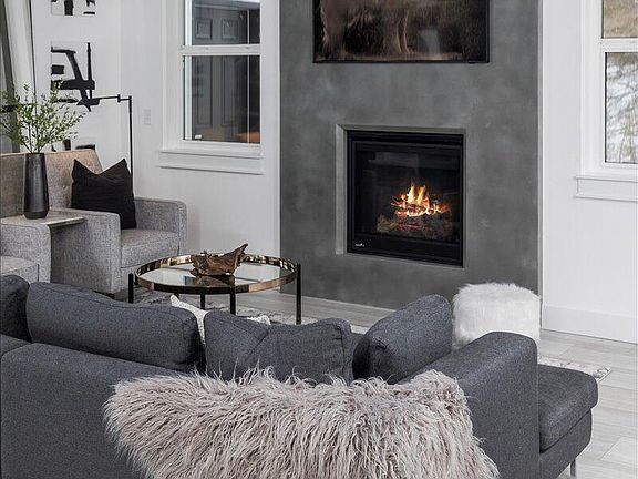 Exquisite home! Gorgeous kitchen with real stone counter tops/ waterfall island / backsplash. Built in desks /cabinets for a home office. Large Master Suite/ WI shower/ soaking tub/ WI closet. Custom Concrete fireplace. Gorgeous lighting thru out. Concrete patio off dining area. Furniture can be purchased. Corner lot. Community park and paving starting Fall 2021. 5 min to Trunk / close commute.