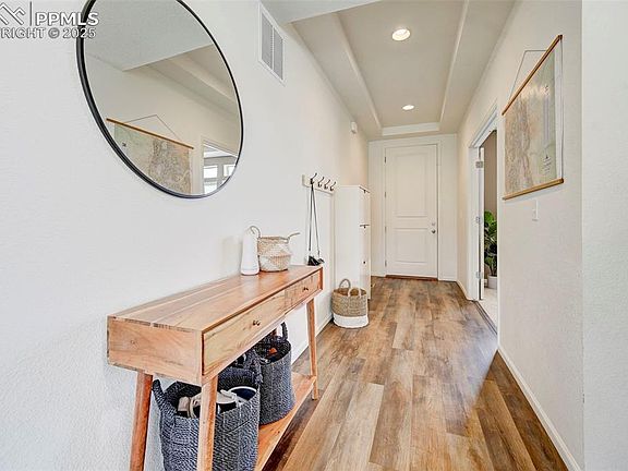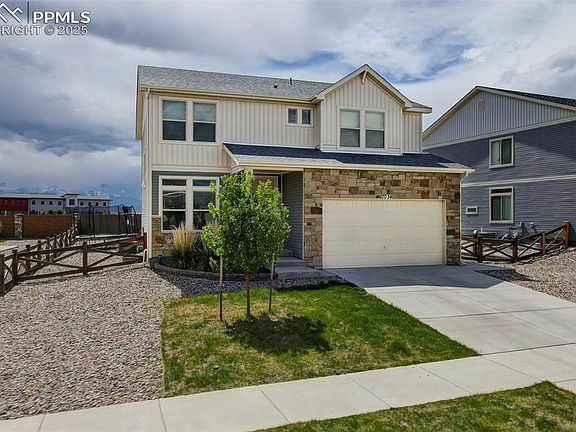 Absolutely stunning 2 story home with panoramic views of Pikes Peak!!! This home features a gorgeous kitchen, 5 bedrooms, 4 bathrooms, 2 car garage, finished basement, patio, and a lot that has separation from rear neighbors in the sought after Banning Lewis Ranch community! Enter through the front door into the main level with open concept living room, dining room, and kitchen, perfect for entertaining guests with walk-out access to the back yard. Spacious kitchen provides generous cabinet storage and counter space. Kitchen also features an oversized island with beautiful countertops, stainless steel appliances, and pantry. An office space is tucked away to the left of the main entry for the quiet solitude needed for the at home worker. Upstairs you'll find the master bedroom which includes a large walk-in closet and luxurious master bath with dual vanity, and shower. A wonderful second living room, bedrooms 2 and 3, the second full bathroom, and laundry room are also on the upper level. The basement has a large family room with wet bar, bedrooms 4 and 5, and full bathroom. The fully landscaped backyard is an entertainers paradise with a large patio and luscious green lawn with partial xeriscaping for easy maintenance. Enjoy your summer evenings barbecuing or playing games in the fully fenced rear yard with no rear neighbors. This home has it all and it's in the Banning Lewis Ranch community with amenities galore, including neighborhood schools, over 75 acres of parks/trails/open space, tennis courts, basketball court, rock climbing parks, zip-lines, access to pools, splash pad, water park, and dog park. Recreation center houses a fitness center and also regularly hosts classes and events for all ages. In the summer months, catch a neighborhood concert, festival, food trucks, farmers market or enjoy other regular community events.