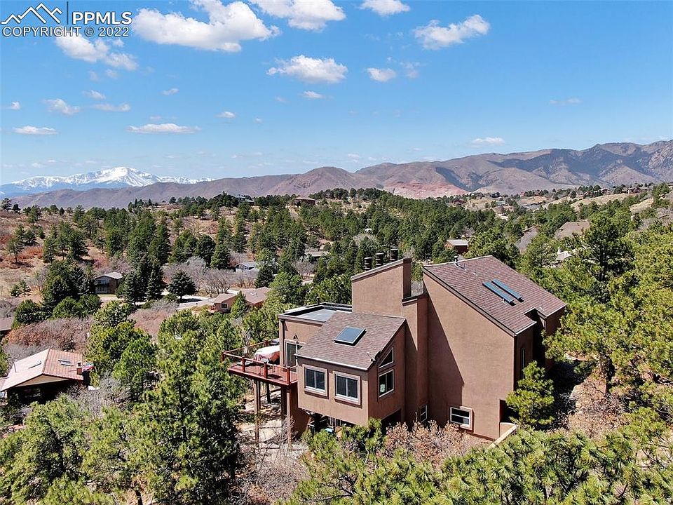 Phenomenal Views.. Not only is Pikes Peak framed from your windows, but you can see all the way from Norad to Blodgett Peak plus city views - LOADS OF PRIVACY Such the ideal location tucked off a cul-de-sac and 1.35 acres!! You don't find properties like this every day. You will feel like you're in your own little oasis. Located just blocks from school and park, close to shopping, minutes from I25, hiking and biking trails minutes away!! A true Colorado home!! The vaulted great room with a floor to ceiling stone fireplace makes a statement! The open floor plans flows into the Dining area and Kitchen where you are greeted with spectacular views of the Front Range. Lot's of updates here..granite countertops and an under counter beverage cooler and a cute area for a coffee bar, and don't miss the walk-in pantry with included refrigerator!! There are two sliding glass doors to a spacious deck where you can relax and enjoy the peace. Next check out the sweet sun room perfect for a little yoga or reading a book curled up to one of 3 fireplaces. Master has vaulted ceilings, balcony with Pikes Peak view, 5 piece bath and a sauna!! There is plenty of storage through out this home, large garage with storage and a crawl space for more storage if needed. 5th bedroom ideal of home office. So many wonderful features: newer roof, beautiful windows, granite kitchen counters, stainless steel appliances, under counter beverage cooler, lighting, skylights, decking, hot tub, baths with granite counters, tiling, hardwood floors in sun room, new flooring in family room. Additional parking area off the driveway. Come enjoy this true Colorado home!
