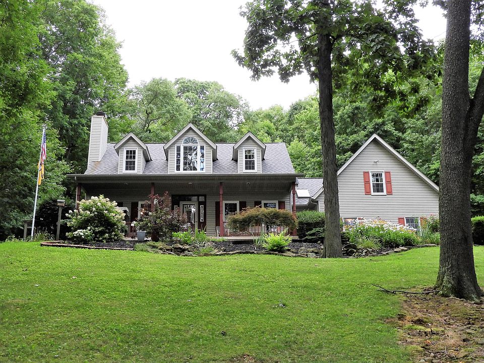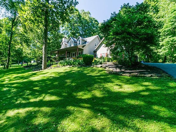 Serene, secluded countryside retreat! Nestled into 5.4 wooded acres, overlooking a 2-acre pond, this custom Harter built Cape Cod is loaded with the upgrades and amenities any discerning Buyer will appreciate. A stone walkway leads through the garden to the welcoming full front porch. Entry door is designed with leaded stained glass and transom windows. The 2-story grand foyer is flooded with natural light from the palladium window above. The first floor Owner's Suite offers a walk-in closet, Jacuzzi tub and skylight. An in-law suite above the garage provides privacy for guests and family and has separate entrance. Upgrades include: new windows (2011), 4-season Solarium, water softener, central vacuum system, dual fueled HVAC (2011), full finished basement, intercom, Home warranty included