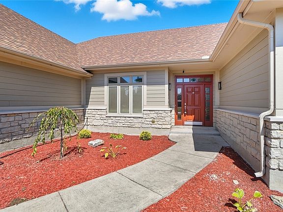 Situated on a spacious one acre lot in the desirable Stone Ridge community of Springboro, this 4,248 sq ft split level home offers a hard to find first-floor owner’s suite with his-and-hers closets and a freshly remodeled ensuite. The main level features 9-ft ceilings with crown molding, transom windows for abundant natural light, and a living room anchored by a floor-to-ceiling stone fireplace with gas log set. The granite kitchen impresses with 42" cabinets, a two-tier island with bar seating, stainless appliances (including wall oven and cooktop), under-cabinet lighting, and a planning desk. The dining room is accented with a tray ceiling, crown, and chair rail, while the first floor laundry room includes upper and lower cabinets plus a utility sink. Upstairs are three spacious bedrooms and an updated hall bath with double sink vanity. The lower level is perfect for entertaining, featuring a home theater with projector, screen, surround sound, wet bar with mini-fridge, a full bath, and a 5th bedroom with egress. Daylight windows allow for plenty of natural light. Outdoor living shines with a large patio, custom wood-burning fireplace, decorative raised flower bed, and hot tub. Recent updates include fresh interior paint throughout, lighting, ceiling fans, bath remodels, fresh landscaping, and a new roof (2024). Additional highlights: 3-car side-entry garage with insulated doors and built-in shelving, wood casement windows, 18" ceramic tile, and a high-efficiency Trane gas furnace with Aprilaire humidifier. Copy/paste for self-guided tour https://bit.ly/4mhONIn Quick occupancy available. Be sure to put this one on your list to see! Some photos virtually staged.