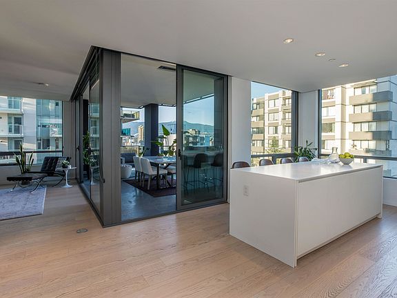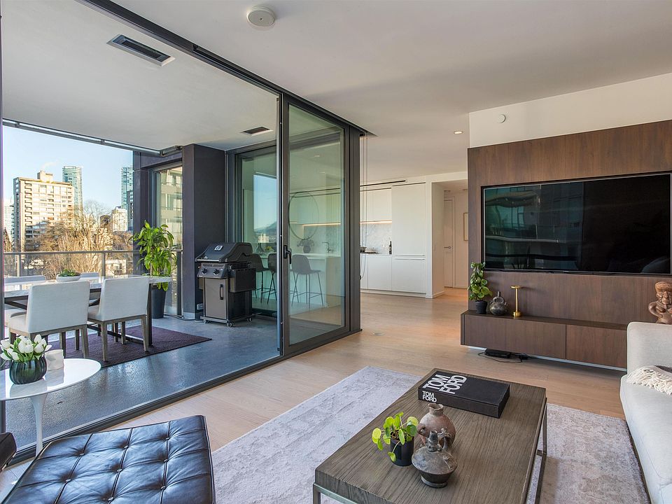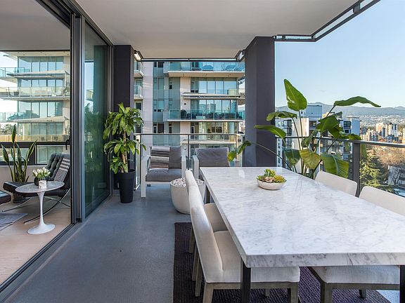 The Jervis is a beautiful collaboration between Intracorp & Inform Interiors. This 2-bedrm, 2-bathroom corner residence spans 1,155 sf & features city & mountain views. Featuring an oversized gas-equipped covered terrace, it is ideal for entertaining guests. The kitchen is furnished w/ TLK cabinetry by Inform, Bianco Statuario marble backsplash, Gaggenau appliances and a large centre island. Bathrooms are finished with marble tiles, Gessi faucets & Duravit plumbing. The primary ensuite provides dual basins, a walk-in shower, a separate soaker bathtub and in-floor heating. Additional features incl: Kico Home Elements closets, customized millwork and A/C. Building amenities consist of a concierge & fitness centre. The Jervis is boutique development of only 58 refined homes.