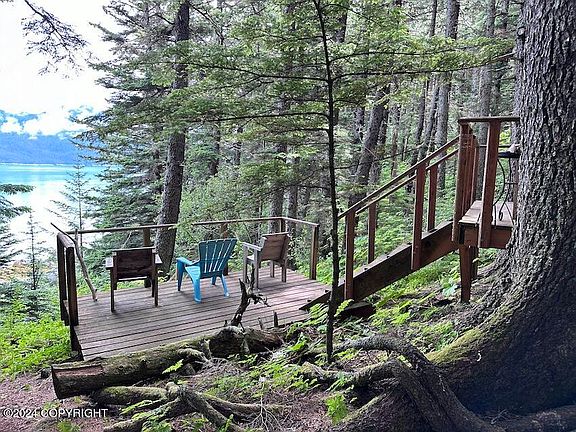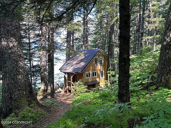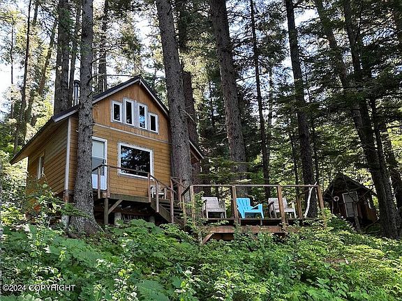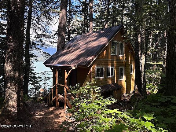 Charming dry cabin w/sleeping loft on wooded waterfront lot, w/ocean view, close to town. Wood siding/trim and custom finish work. Drilled well, electrical, and wiring in place ready to hook up. Paths and stairways lead from road level garage to cabin and deck. Cableway system and windlass for hauling bulky/heavy items. Small bridge over trickling creek to storage shed. Beach access via steps.