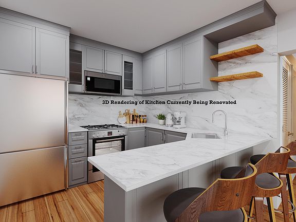 **Huge Private Patio**Garage Parking**In-Home Laundry**CAC**Pet Friendly** Elevator Building**Sunny 2 bedroom / 2 full bathroom home features ideal open layout. Brand new kitchen with stainless steel appliances, quartz counters & backsplash, breakfast bar with counter seating, & pantry. Brand new LVT flooring throughout. King size primary bedroom with en-suite bathroom and custom walk-in closet. Boutique elevator building, conveniently located near NYC transit, parks, & shops. Available May 1st. This beauty has it all!