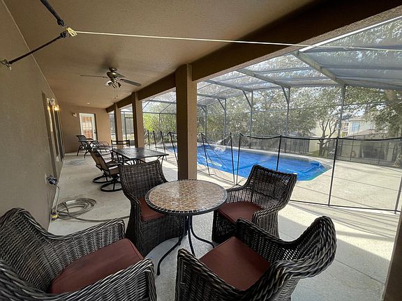 This beautiful 5 Bedroom, 3 Bath home is in Legacy Park. Fully furnished featuring two master suites - one downstairs and one upstairs and 3 additional bedrooms downstairs. Great open floor plan and vaulted ceiling, formal living and dining rooms, plus open family room and huge eat-in kitchen. Large screened Lanai, oversized heated pool , Nice view of the sun setting, close to all the Attractions. Owner pay HOA, tax, trash; tenant pay electricity, water, cable...