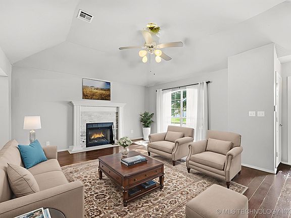 Former Builder's Model in Broken Arrow Schools! Beautifully maintained 3 bed, 2 bath home with spacious kitchen, wooden cabinets, built-in pantry and kitchen nook. All appliances - Washer, Dryer & Fridge stay! Dining room with tray ceiling & crown molding. Vaulted living area features wood-look laminate flooring and cozy gas quartz stacked-stone fireplace. Master bedroom easily fits king size furiture. Jetted tub, separate shower and double sink vanity in master bath.