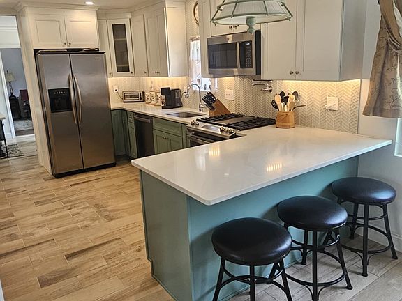 Welcome to this masterfully updated ranch-style home where modern elegance meets coastal charm. This stunning 2-bedroom, 2-bath residence has been completely transformed—inside and out. Step inside to discover vaulted 12' ceilings in the living room and master bedroom, outfitted with hanging ceiling fans and dimmable hi-hat lighting. The open-concept layout flows seamlessly into a show-stopping kitchen featuring 21st-century soft-close cabinetry, quartz countertops, a pot filler, under-cabinet lighting, and a stylish herringbone glass tile backsplash. Premium GE and Frigidaire appliances—including a gas range, dishwasher, microwave, and a refrigerator with filtered water and ice—complete the space. The adjacent laundry room includes a Whirlpool washer and gas dryer with storage drawers. Throughout the home, enjoy new laminate flooring in the bedrooms and living areas, and ceramic tile in the kitchen, bathrooms, and laundry room. The guest bathroom offers a Bluetooth-enabled exhaust fan, Moen fixtures, black marble vanity, and a 3-stagelighted defogging mirror. The luxurious master bath features a double vanity, 72" multi-color lighted mirror, marble-tiled walk-in shower with rainhead, bench, and dual niches—finished with a stylish picket barn door for privacy. The exterior of the home is equally impressive. The house boasts all-new roofing, siding, windows, and doors, with azek and PVC finishes throughout. Extensive drainage and erosion control measures have been installed, including 4.5 oz non-woven fabric, 3 tons of washed gravel, and new sod across the oversized yard. A 10x16 workshop shed—built to match the home—offers power and lighting for hobbyists or extra storage. Enjoy the new front and back storm doors, outdoor lighting, frost-free hose bibs, and GFI outlets, plus supplied hot/cold water for an outdoor shower. Upgrades continue behind the scenes with brand-new electric and plumbing systems, a 2-ton Goodman HVAC unit providing heat and A/C, a vapor barrier in the crawlspace, attic lighting, and storage flooring. Gas lines have been run for both laundry and a future fireplace in the master suite. Located just moments from the bay and convenient to shopping and dining, this home offers the perfect blend of coastal serenity and modern convenience.
