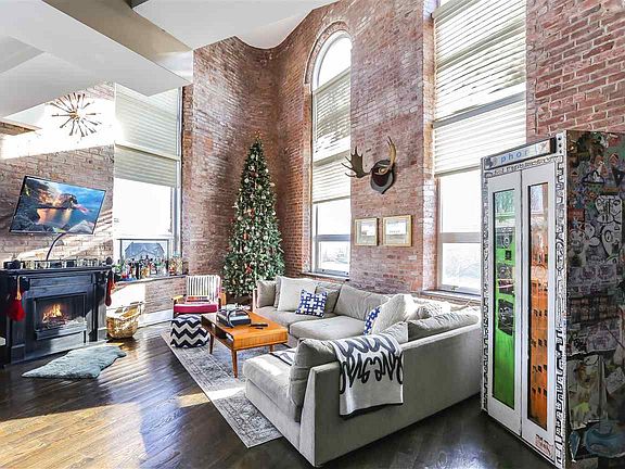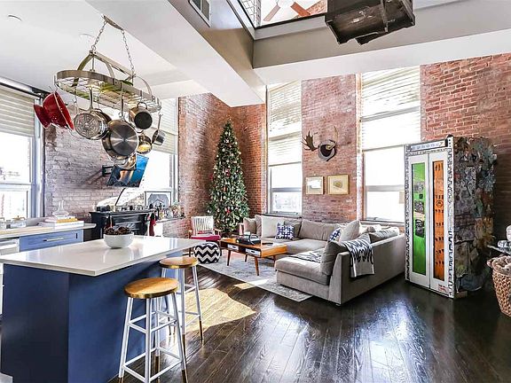 Soho style living in Jersey City with Manhattan views. Unique 1733 SqFt 2 bedroom duplex with all the comforts you deserve starting with 18 ft ceilings. Open style chefs kitchen features espresso color custom cabinets, stainless steel appliances and Cesar Stone counters. Large living area is appointed with exposed brick and beautiful 13 ft arch windows. Other great features include, central air, hard wood floors, luxurious modern bathrooms and deeded parking. Transportation to NYC within a few blocks.