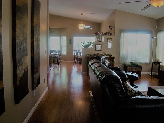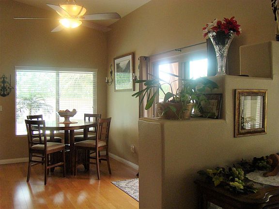 This home is a treasure with so many great amenities. Enter through the retractable screen door. Such a great addition. Then check out the three bedrooms, two full baths, plus a beautiful kitchen with a breakfast nook and a dining area. The large living room has a gas fireplace and there are cathedral ceilings with surround sound throughout the home. Carpets in the bedrooms add warmth with Tile in the bathrooms and beautiful wood throughout the rest of the home. The large master bedroom has a connecting bathroom with a garden tub, glass shower and double sinks plus a walk in closet and a separate toilet room for privacy. The kitchen has granite counters and black appliances and an island for extra seating and work space. Double doors from the dining area and the master bedroom lead out to the covered patio and pool which are surrounded by luscious greenery and a privacy fence. Three fruit trees, Lemon, Lime and Pomegranate are part of the great back yard. The potted plants and removable outdoor lighting does not stay nor does the small removable outdoor lights. There is a large storage shed on the side of the house. The refrigerator will stay with the home.
