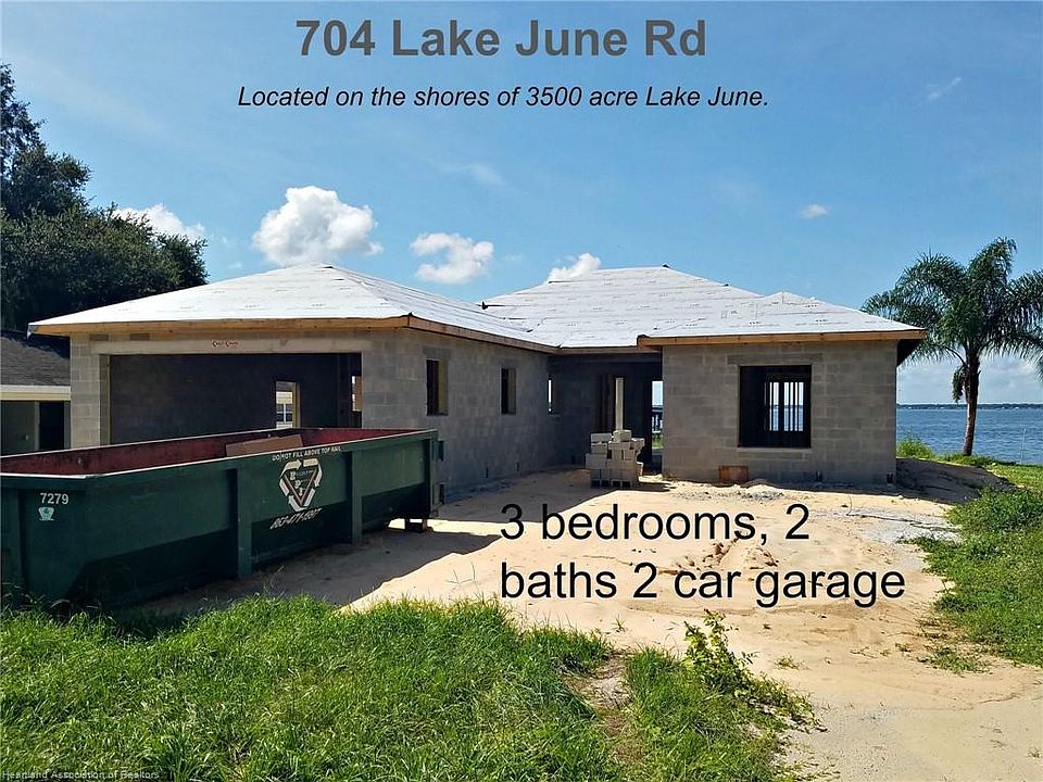 UNDER CONSTRUCTION.......DIRECTLY ON THE SHORES OF 3500 ACRE FRESHWATER LAKE JUNE! Choose your finishes and make this brand new home.....YOURS! This home has been designed to take total advantage of the breathtaking LONG views of Lake June. A METAL ROOF and IMPACT WINDOWS will give your home maximum protection from storms and keep your insurance rates low. Inside you will be greeted by vaulted ceilings and those views......The kitchen is on the left as you walk in. Lots of cabinets will adorn this space as well as BRAND NEW stainless appliances and the best part (if you buy it soon enough) is you can choose the style and color along with quartz or granite counter choice! Big walk in pantry gives you even more room and there is a breakfast nook with two windows to let in the sunshine! Off the kitchen is the indoor utility room leading to the garage. The living area is adjacent to the kitchen in this open concept plan and again.....it all about the views from your sliding glass windows that lead to your covered lanai. To the right of the living room is the dining room with a HUGE picture window so you can watch the stunning sunset over the lake as you dine. Split bedroom plan has two nice sized bedrooms on the right along with a beautiful bathroom with tub (Choose your finishes there too!) To the left is the master and WOW what a master this is. When you walk in you will have dazzling views of the water with large sliders that open to the concrete slab. What will you do with this space? A pergola? Hot tub? The choice will be yours when you own this magnificent home. The master has TWO closets and the master bath offers a large walk in shower (tub on plan can be an option if construction timing permits) His and hers separate vanities and a closed in water closet. Outside the garage has plenty of room for your cars, trailers or toys and has a convenient wash sink. The back yard is designed for lake FUN! You have a sandy beach so put your chair on the beach and your toes in the water while sipping a cold beverage. Bring your boat because you have a BRAND NEW boathouse too! THIS.... is LIVING, THIS.... is LAKE LIFE, THIS.... IS LAKE PLACID....Florida's BEST kept secret!