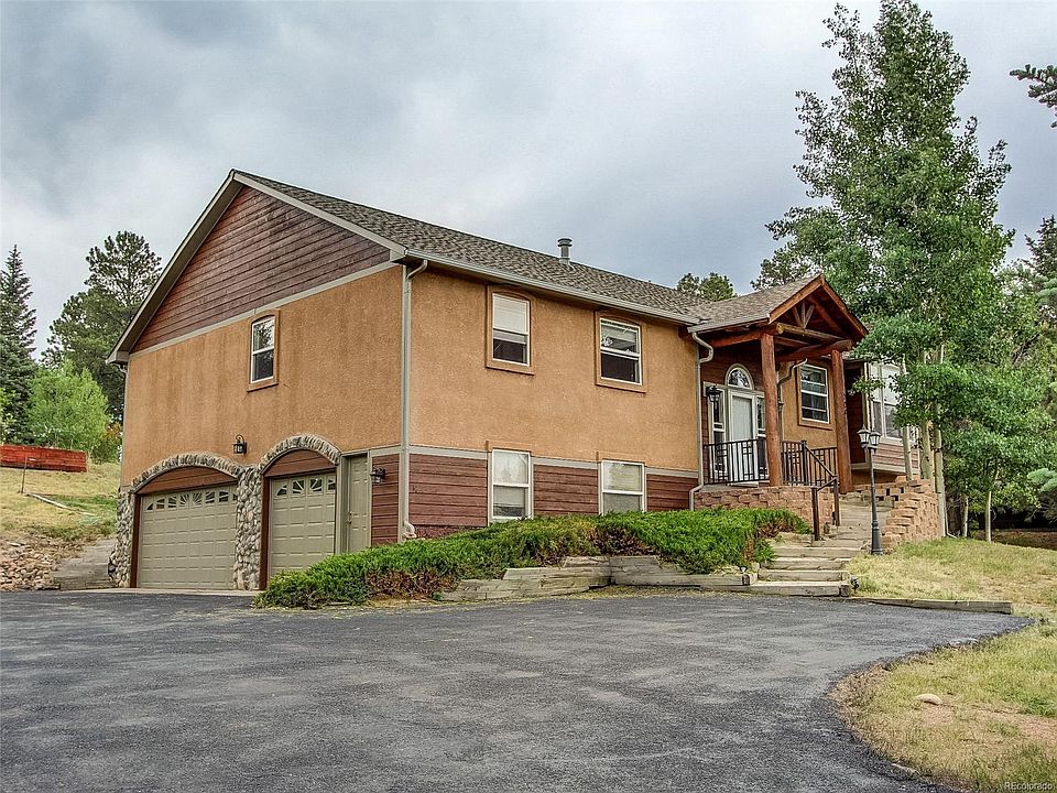 Unique 5 BR/3 Bath home on ½ acre lot w/just enough trees & Pikes Peak views. Conveniently located in desirable Woodmoor w/easy commute to Denver or CS. Spacious living areas with river rock & log accents that give the home a rustic charm. Great room also features skylights, vaulted ceilings and gas FP. Kitchen includes SS appliances, pantry, lots of cabinets & massive island. Master BR features his & her closets & cool new 5-piece bath w/generous soaking tub. Brand new carpet throughout home. Basement has a huge family room, mini wet bar & junior suite. Driveway is newly paved and 3 car garage has built-in storage shelves. Composite deck and serene patio expand living space and are perfect for entertaining. Located close to historic downtown Monument, restaurants and shopping.